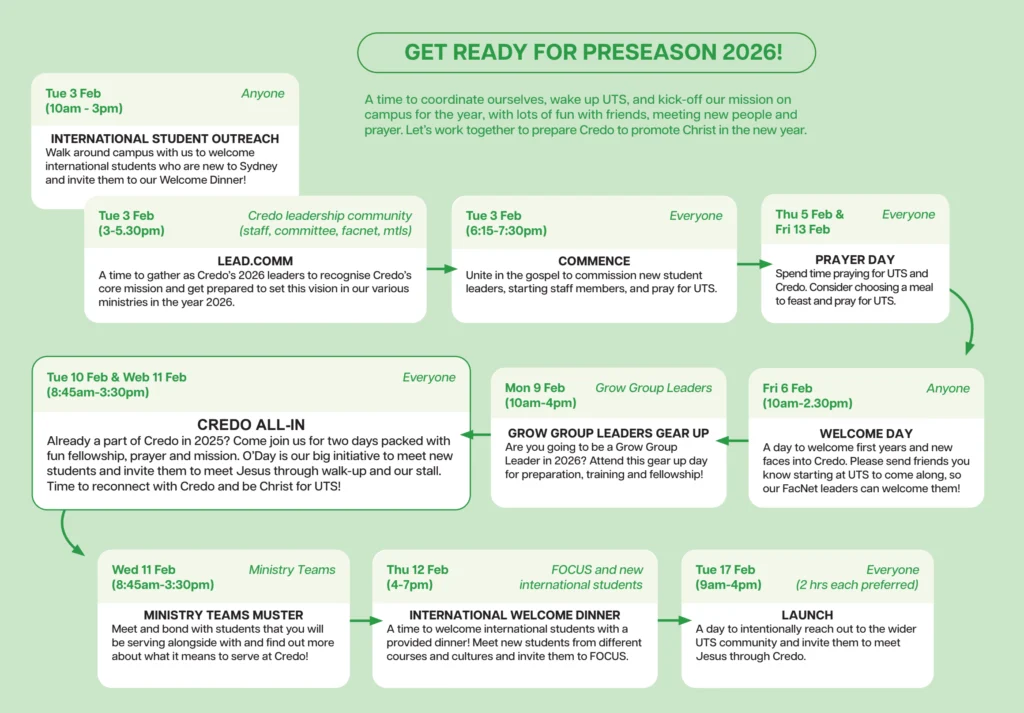 Come join us during Credo Pre-season to enjoy fellowship together, be trained to serve in God’s harvest field at UTS and beyond, and to welcome new students on campus in 2026!